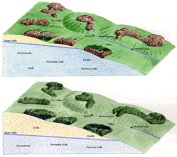 The Lavant Stream in Rowlands Castle is fed by the chalk aquifers of the South Downs. Depending on the amount of rainfall, “the Lavant,” as it is referred to locally, is usually dry in summer and autumn months. In winter and spring months when the water table rises following sustained periods of heavy rainfall, water bursts forth from the chalk aquifers at various spring points creating the Lavant Stream. When the water table drops during drier months, the Lavant disappears, leaving behind grassy dells.